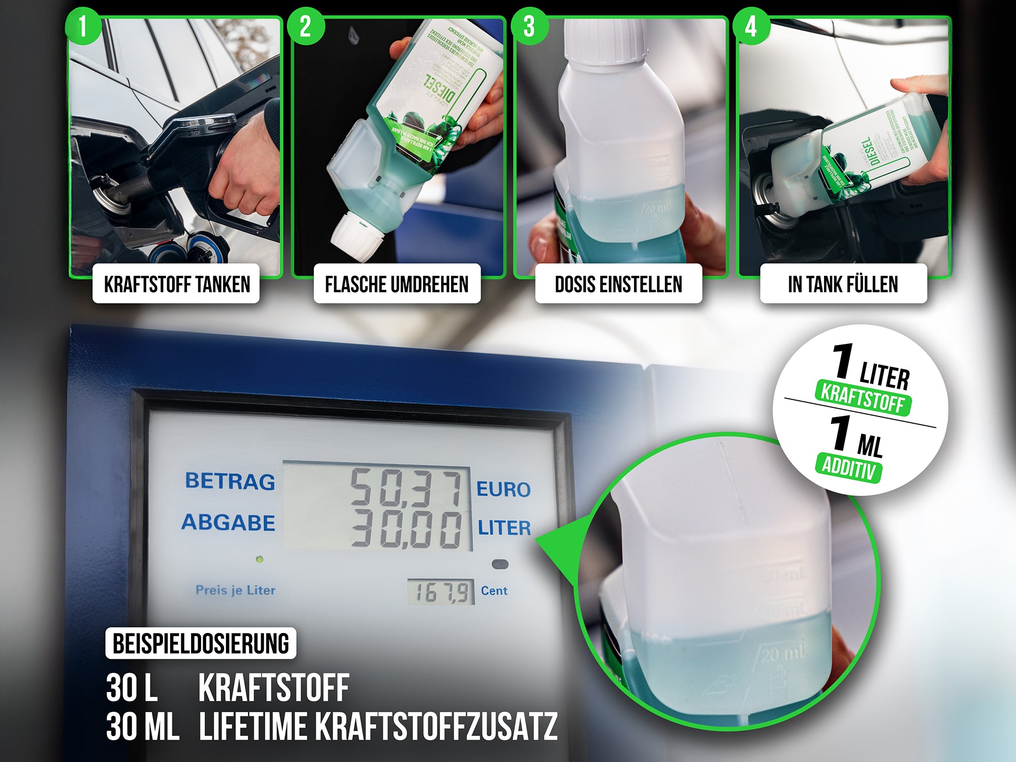 Fügen Sie für jeden Liter getankten Diesel 1ml Longlife DIESEL dem Tank hinzu.