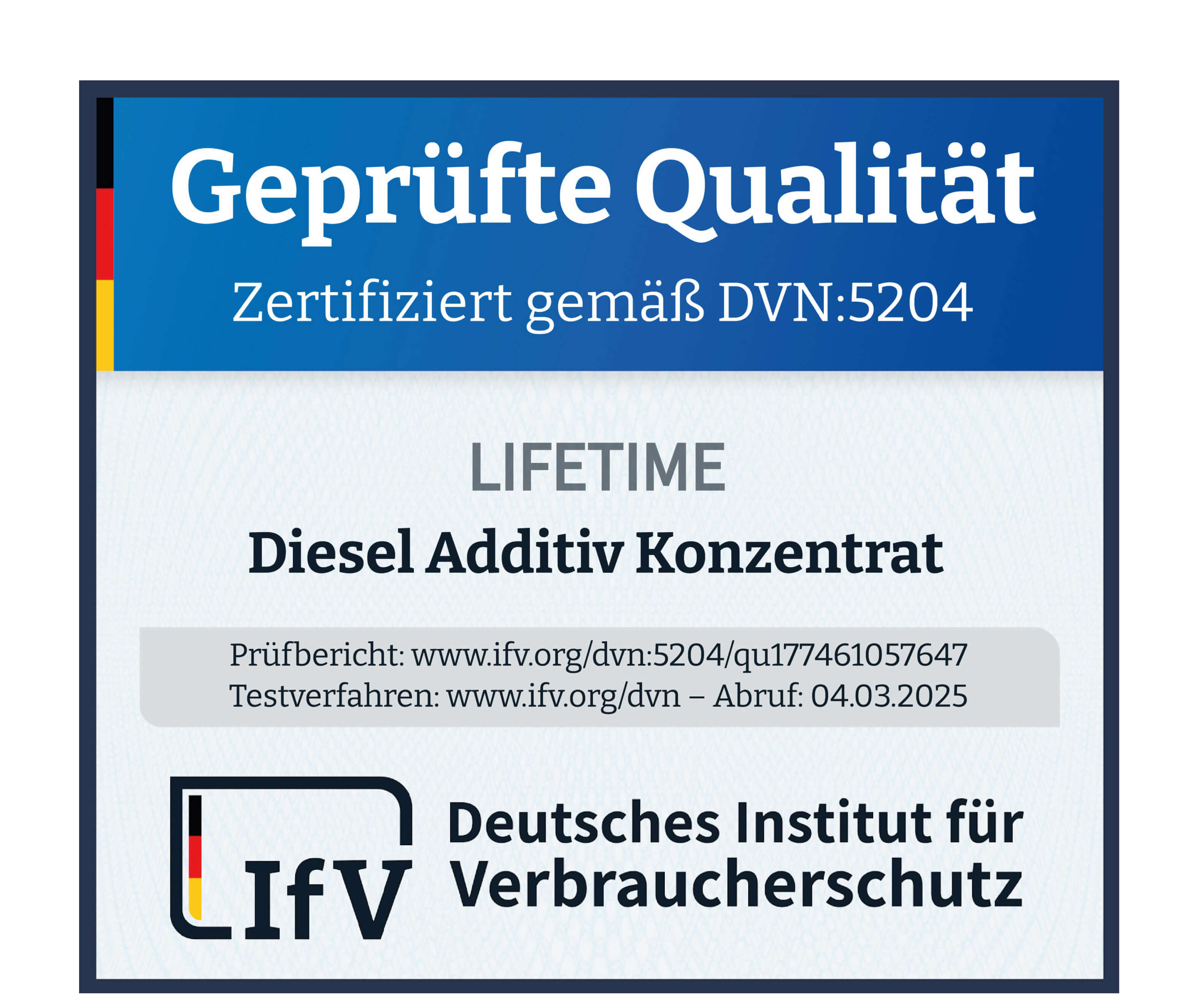 Das Deutsche Institut für Verbraucherschutz hat Longlife Diesel nach der strengen DVN-Norm 5204 geprüft und zertifiziert. Diese Zertifizierung bestätigt die hohe Wirksamkeit und Qualität unseres Additivs – für weniger Ruß, sauberere Einspritzdüsen und einen optimal geschützten Motor.